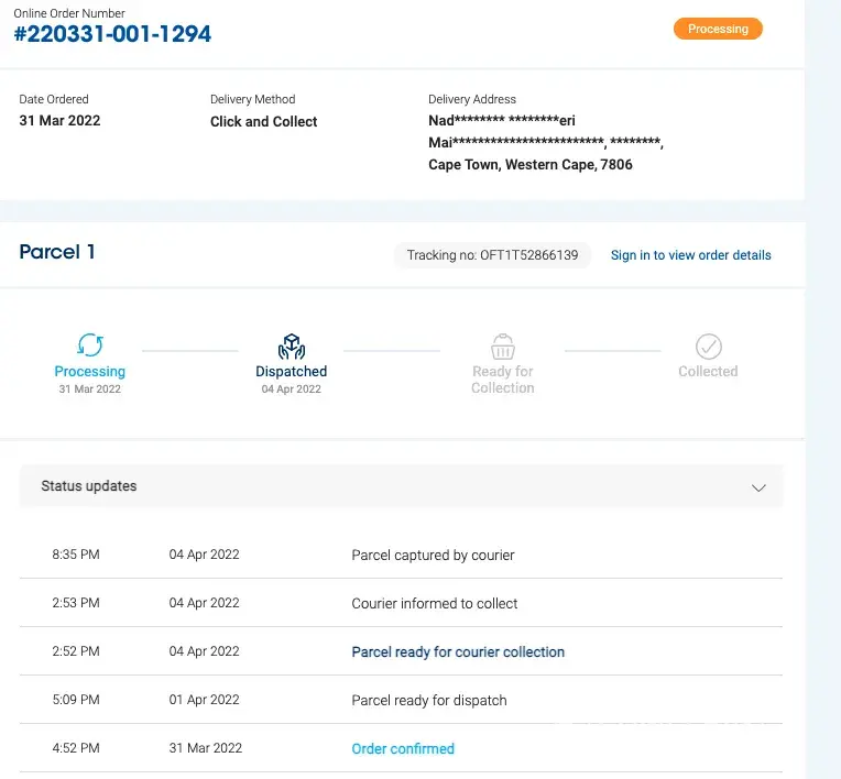 After this, there was no communication whatsoever from Clicks or the courier service. I was becoming quite concerned as I had received no word from them and nothing on parcel tracking.