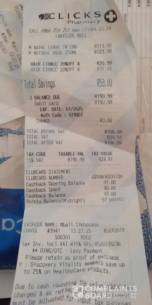 Very dissatisfied and disappointed in Clicks and my problem is still not resolved.