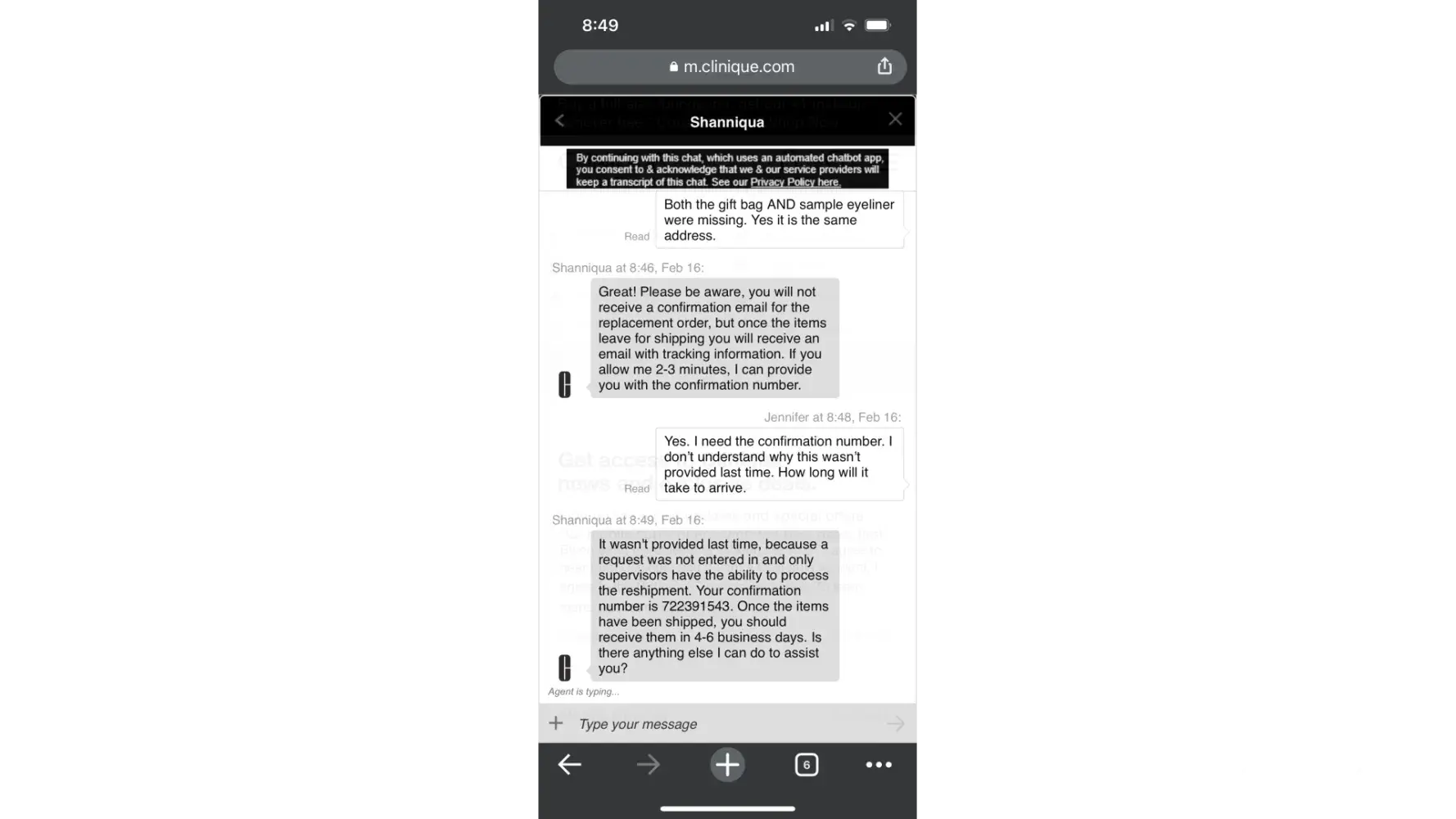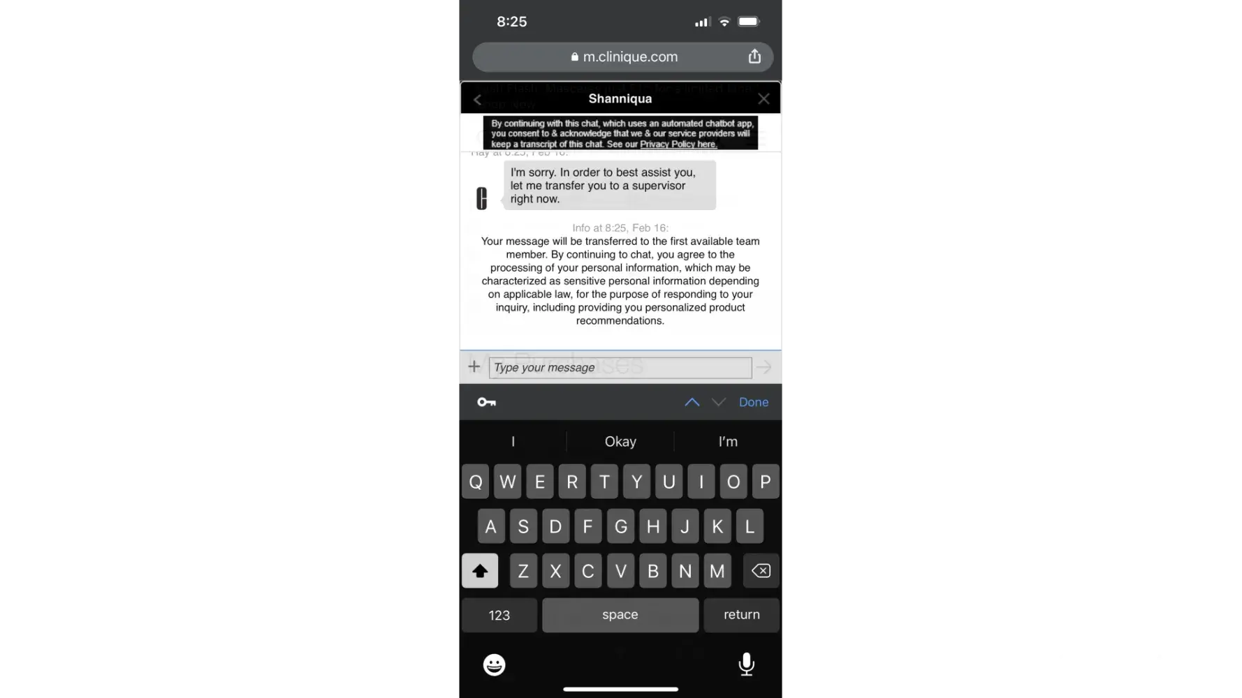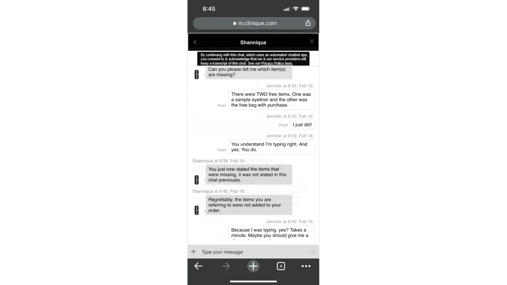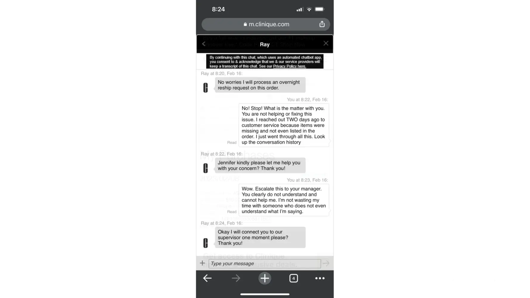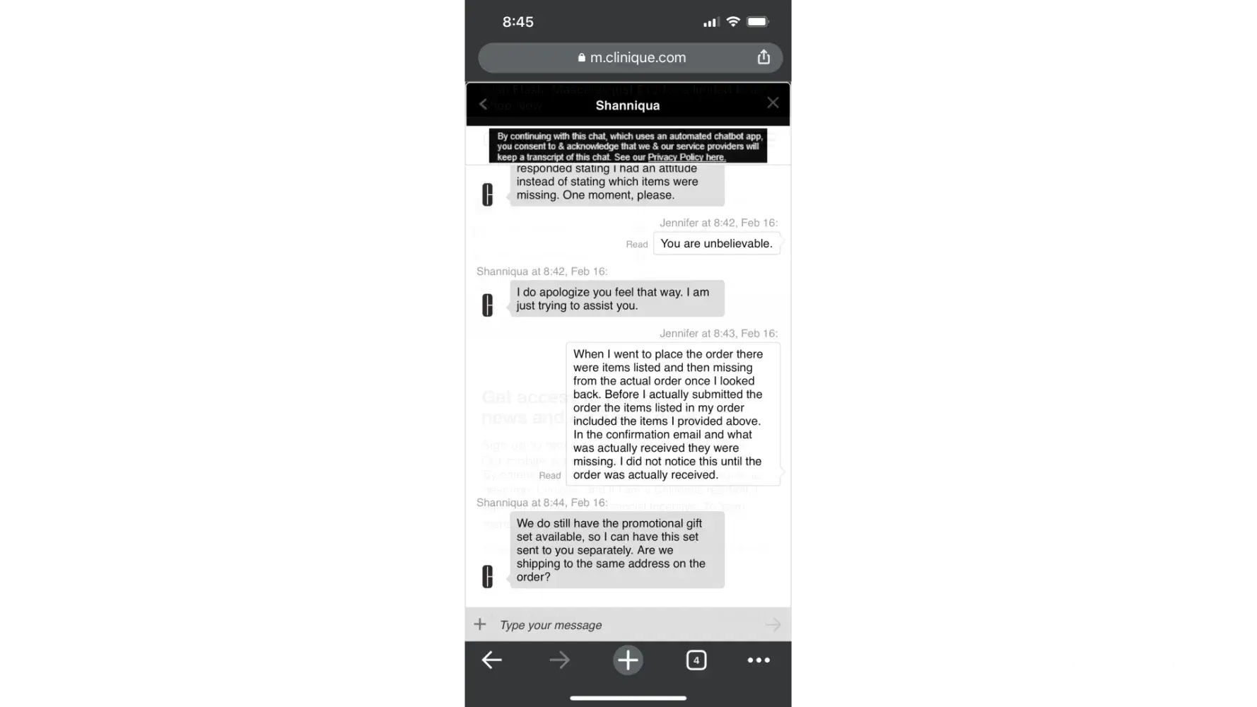 On Feb. 21 I received the missing items only to find that the promo kit was not correct and, not only that, it’s one I cannot use half the product of. It contains several perfume items, which I’m allergic to, as well as lipstick that I cannot use. I reached out to customer service chat again, and was connected with Shanniqua again, who does not seem to remotely care about my very poor experience with Clinique. After another lengthy chat Shanniqua finally decided to explain that if an order does not qualify for a product it will show on the order but once you submit it, Clinique will delete it from the order. This is false advertising and a completely unethical practice. I cannot believe they have been getting away with processing orders in this manner. Shanniqua specifically is not equipped or capable of being a supervisor. All her responses were unhelpful and did not acknowledge or resolve the issue. In addition, they completely lack a customer service mindset and displays a negative, disagreeable outlook through the entire conversation that only exacerbates the issue.