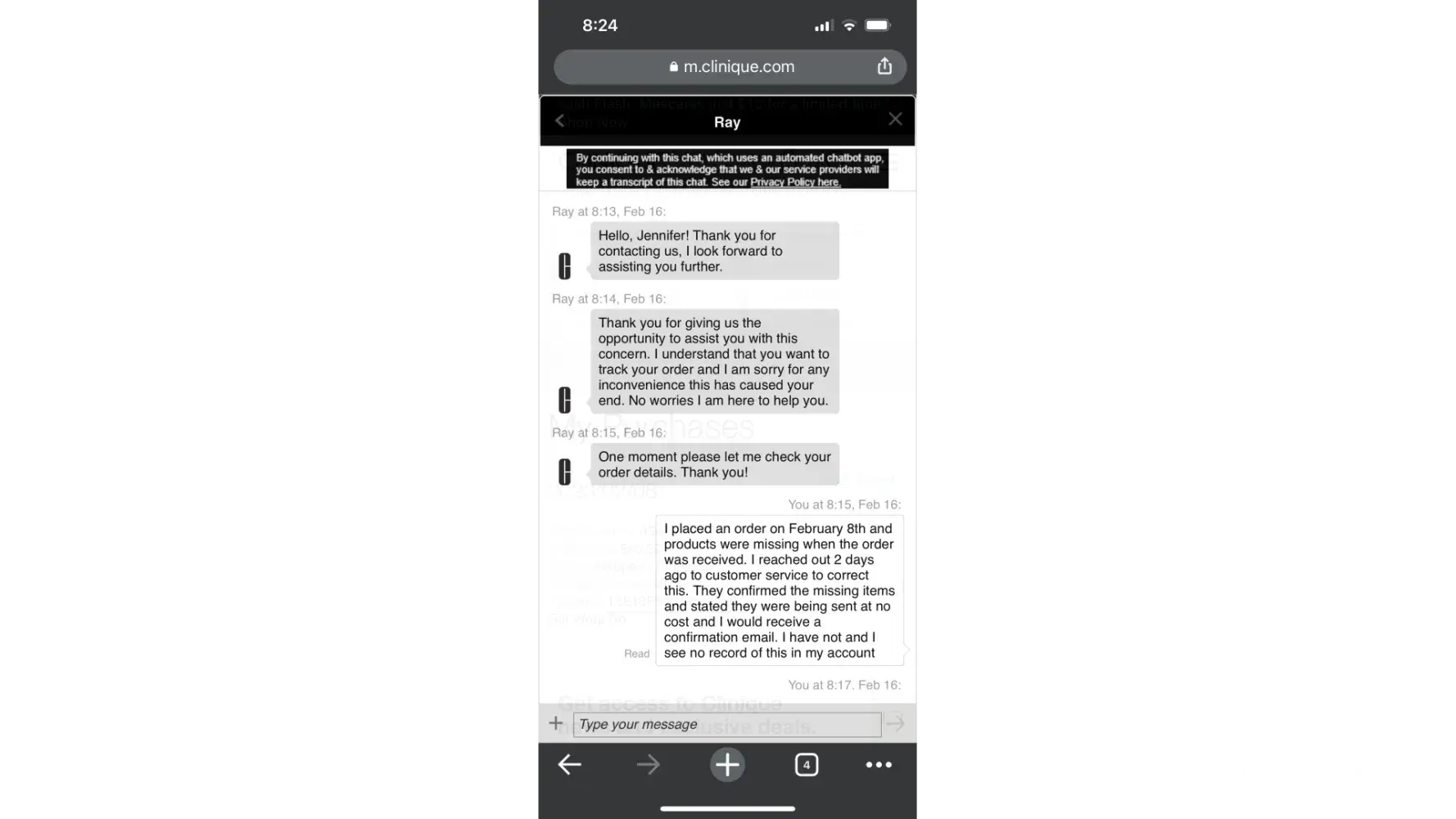Clinique order and customer service.