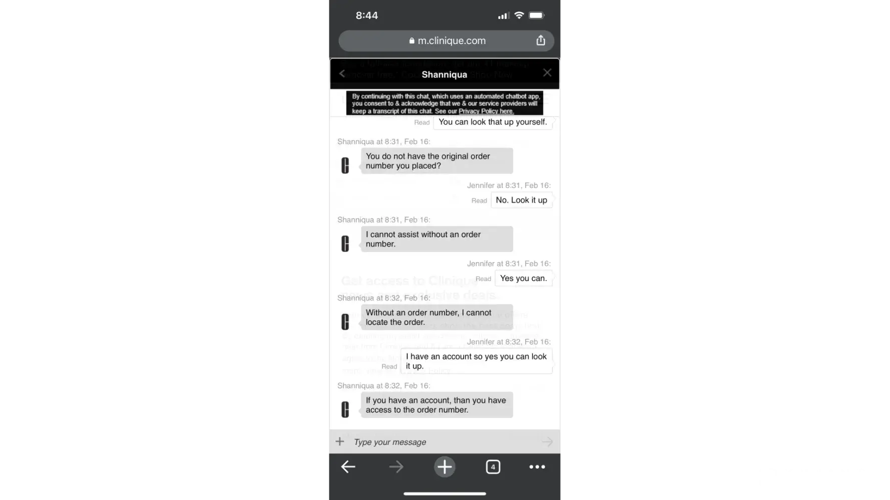 I just spent about an hour chatting with various reps on Clinique.com. They are not able to find my order after I stated that initially I didn't have an account with the site and I often checked out as a guest, especially if I wasn't home with all of my various passwords at hand.