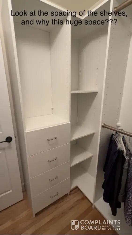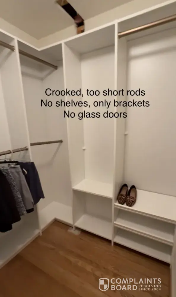 I paid Closets by Design $3,250 for a custom closet system in August 2025. As of today (April 2026), my closet is still incomplete and unusable.