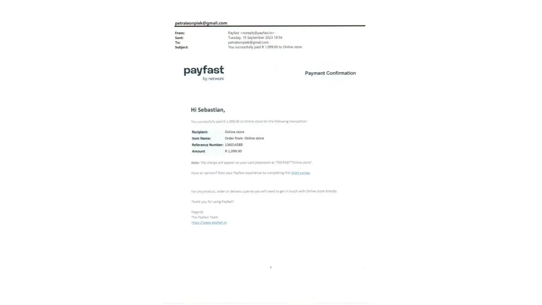 I ordered a Rugby jersey for my son through a website called Bokkie Nation. The payment went through Payfast. This was on Monday 19/09/2023 at around 19h30. On Friday 23 September, I asked about the delivery time span - now answer. Since then, I have not been able to make any contact with them. Payfast payment no #[protected] Amount r1099 Hope someone can helo a very disappointed 17 year old!