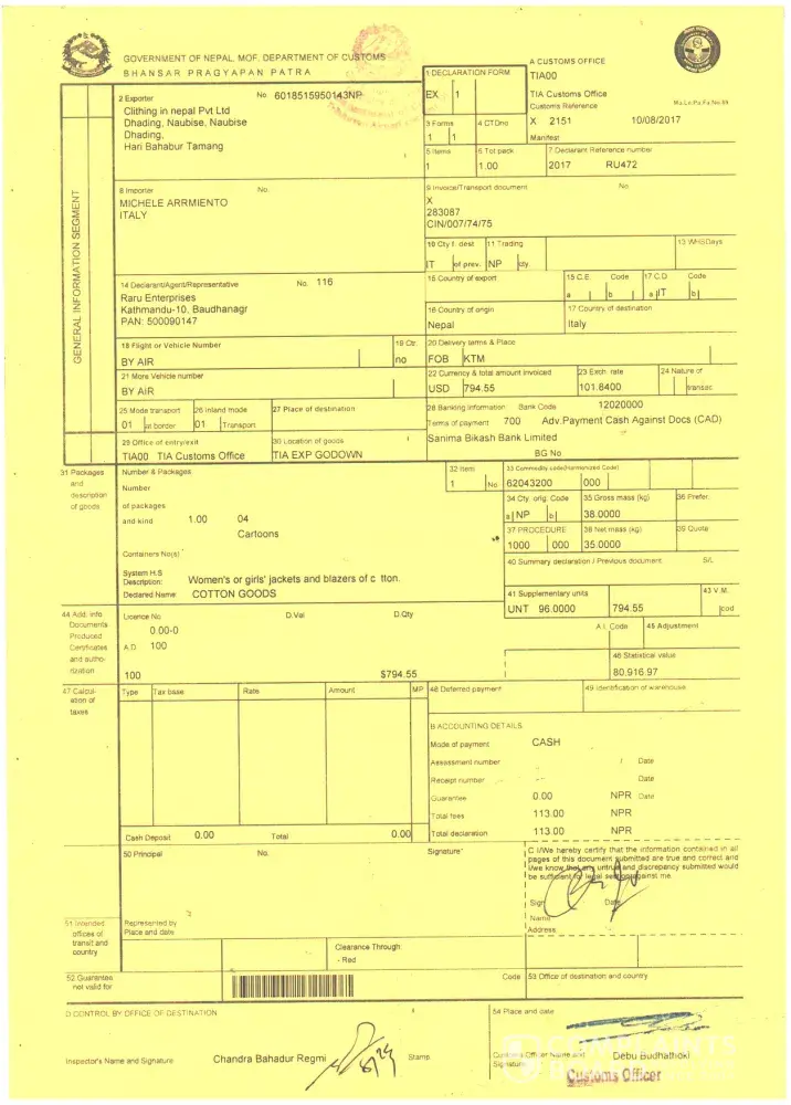 I place an order with Clothing in Nepal. Paid in full. They just make excuses and say they are waiting for the export documents. I have been waiting 3 weeks. I think they have scammed me. Don't buy from this company.