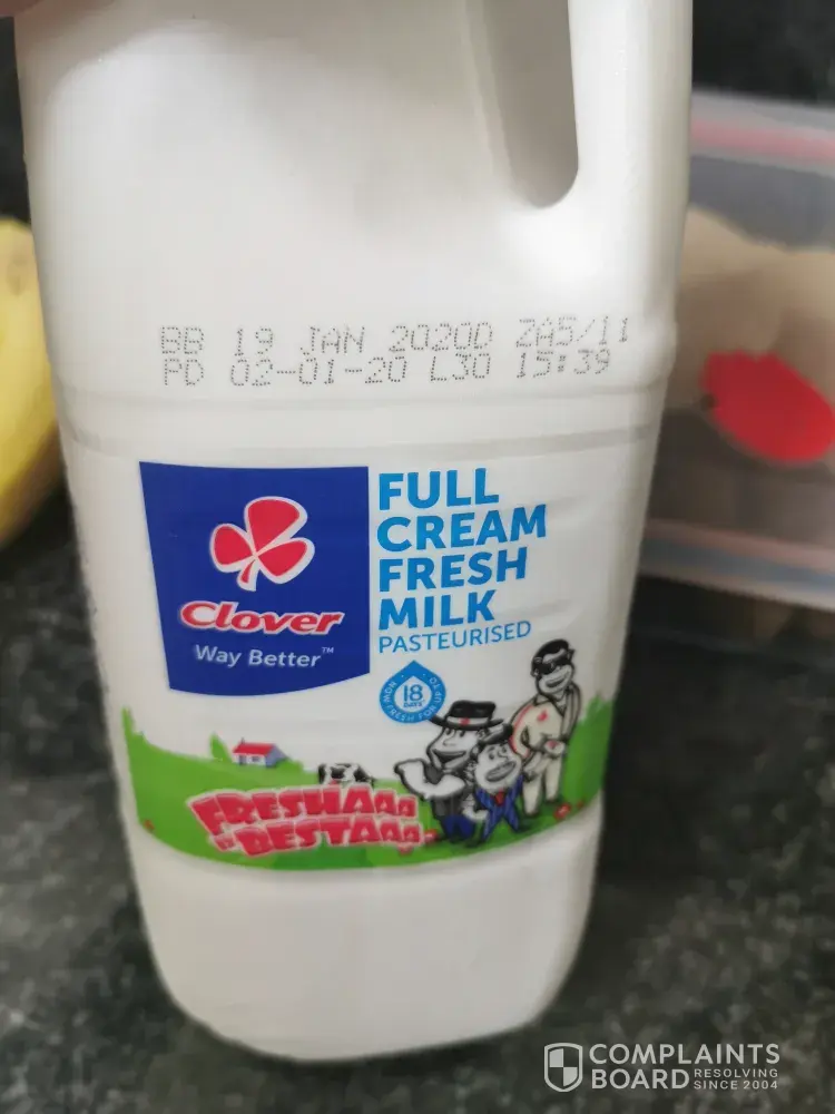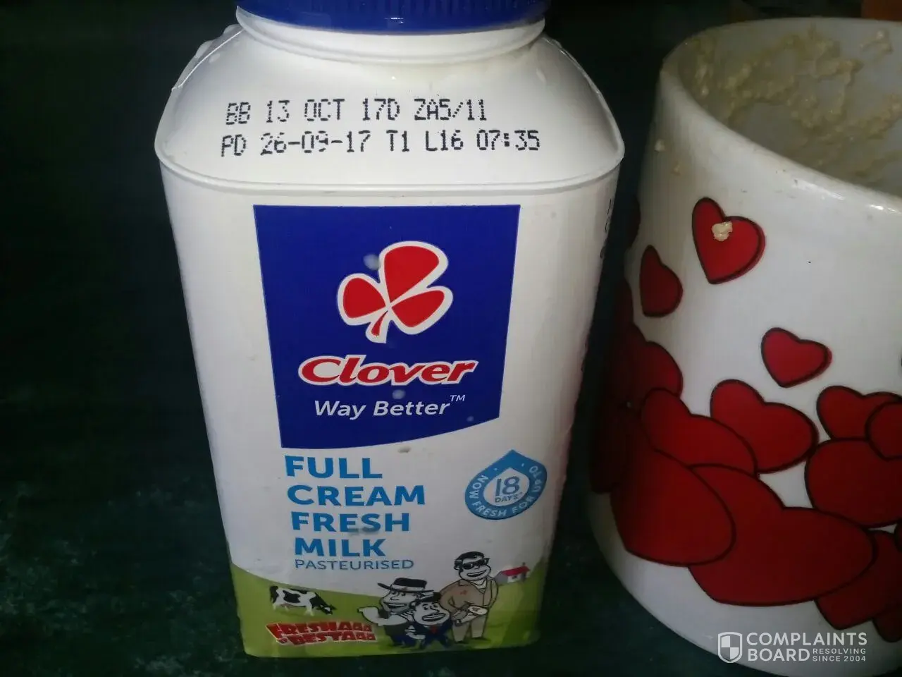to whom it may concern? I've bought a small bottle of milk for my breakfast today, after a boiled the water and poured it from kettle into the cup I put milk into the cup. It a couple seconds later when the milk turned thick and discoloured the milk started to smell in the cup I was frustrated and furious coz I was really feeling to have a cup of milk tea. I was pissed off, I've check the expirery date and it looked fine so I had to go back to the shop and explain the shop keeper about the off milk that I had, he did refund me the money back however my wife and couldn't believe the poor product that clover had sold to us as the consumer band i had to take my daughter for extra tuitions coz she's in matric and this got her late for her classes We always buy clover and we know that's its the best im a very very unsatisfied and disheartened consumer which clover had to put me through all the inconveniences because of a spoilt milk