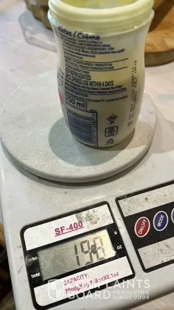 Your scales measured a mass of 198 grammes, not a volume of 198 millilitres and you failed to take into account the density of the cream. Read a physics book!