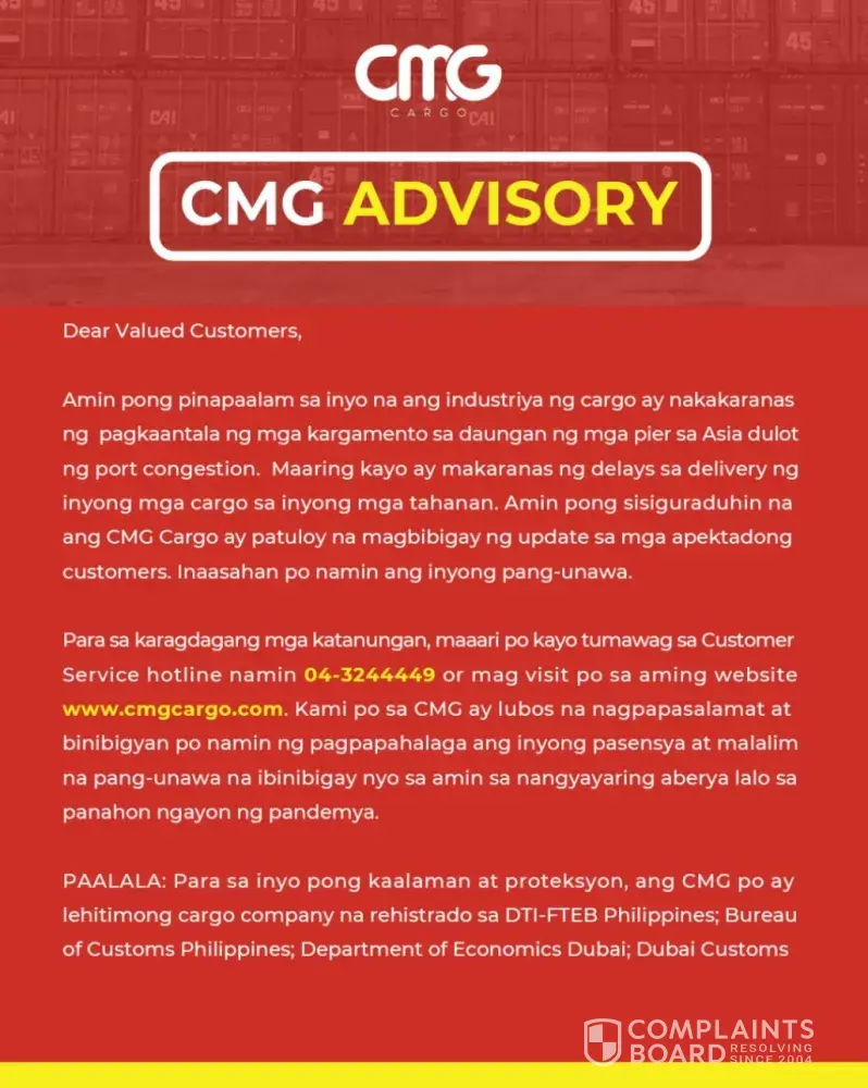April 27, 2021 pinick up nyo sa bahay namin sa Sharjah ang box and until now wala parin. Una lumabas sa tracking nyo May 30 arrival sa port Manila. Tapos bigla nyo binago naging June 18 doon palang sobrang layo na. But then we understand kasi sabi nyo my port congestion sa Singapore at sure na sure na ang June18. And last night I check again its shows that move again to June 20. Nagpapalow up ako sa fb messenger nyo pero mayayabang pa kayo. May isa ako nakakausap sa watsapp na maayos ayos. And then nilagay nyo estimated na nman is July 16? How come hindi nyo ba alam mga masisira namin pagkain doon sa box at mga gamit na pinagipunan namin. Tapos kayo mga tga cmg cargo mga wala pakialam move kayo ng move so anu dina lng kami mg complain at kung gustuhin nyo hndi na deliver samin box namin ganun nalang. Well anyways may paglalagyan kayo. Pinaka bulok na cargo shipping. Nightmare! Almost 3 mos Manila area lang. Umaksyon kayo sa mga reklamo ng mga costumers nyo kasi kung hindi samin hindi kau magkaka meron trabaho. Mga wala kayong awa.
