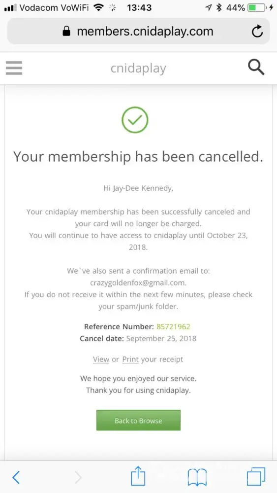 On 15 August 2018 ( cnidaplay)charged my visa card AUD 38.44 without authorisation.