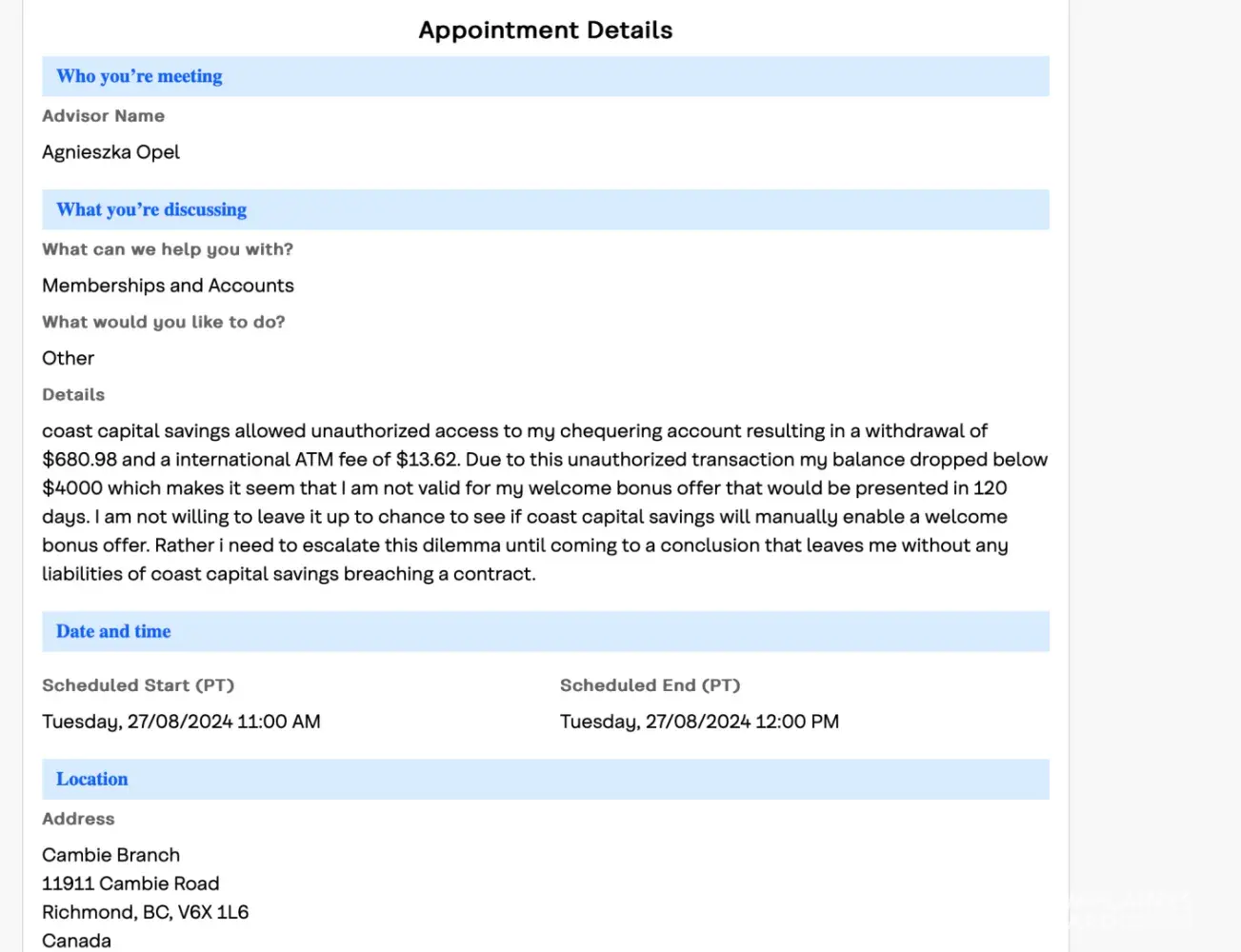 I requested written confirmation that the unauthorized transaction would not impact my eligibility for the $400 welcome bonus. Despite assurances, Coast Capital Savings has refused to provide such written documentation. This situation underscores a broader failure of Coast Capital Savings to uphold its contractual obligations and protect customer funds from unauthorized use. Their verbal assurances are insufficient in light of their evident shortcomings in adhering to business law and safeguarding consumer interests.