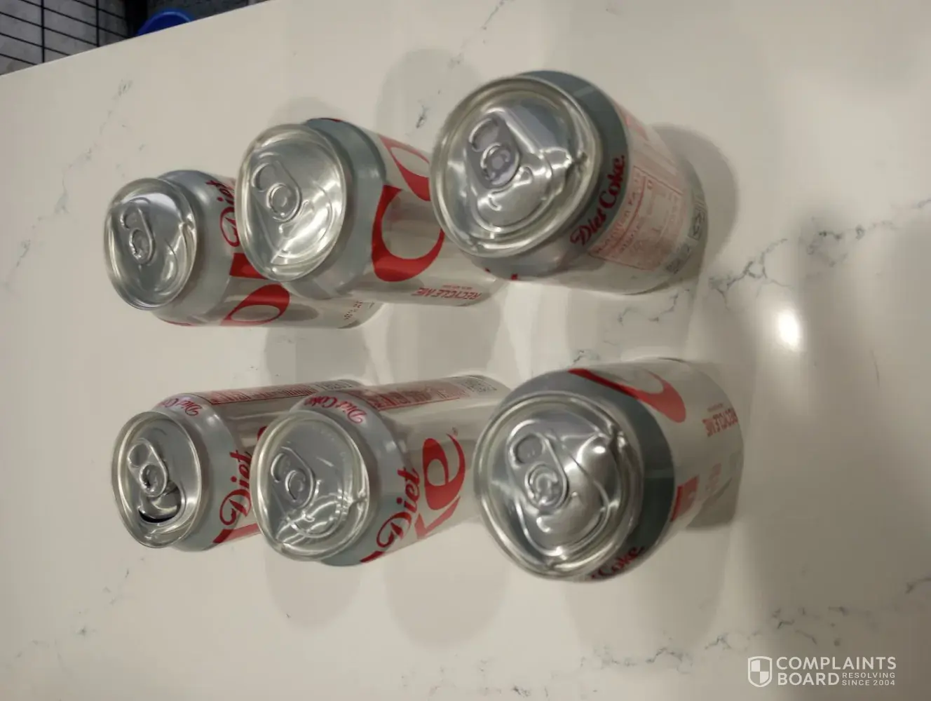 I have a problem with exploding cans of soda. We purchase 3 cases of Diet Coke every week from Meijer and have had this problem before but not to this extent. The cans are swelled on the top and when left on counter they continue to expand a bit and make metal popping sounds and had one explode out the top and I was lucky it sprayed on a angle and not on the ceiling. Like I stated this not the first time of having this problem and we just dump them out because the flavor is not good from these cans. I have attached photos of the cans from one of the 12pks and the carton also. Thank you for you time Todd Thiry 409 East Hobart Ave. Findlay, Ohio [protected] [protected]@yahoo.com