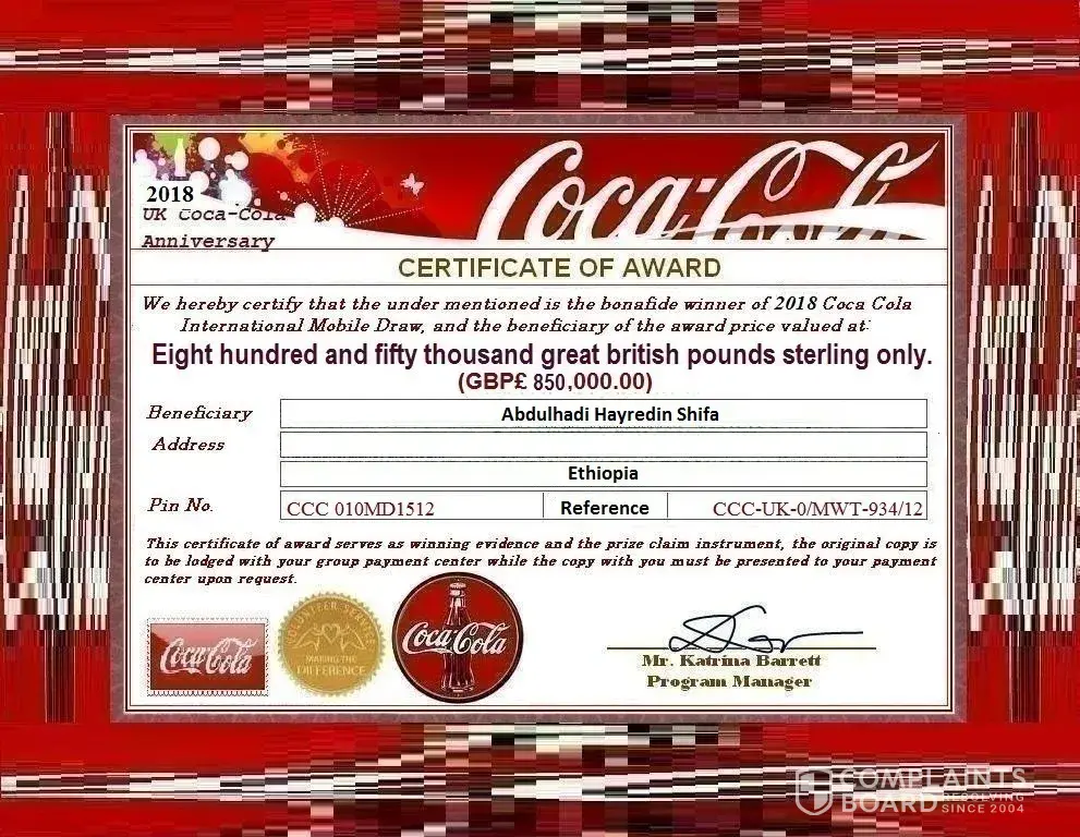 Do not tell people about your Prize Award until your money is successfully transferred to you to avoid disqualification that may arise from double claim. You may also receive similar e-mails or SMS from people portraying to be other Organizations or Coca-Cola e-Lottery. This is solely to collect your personal information from you and lay claims over your prize. In event that you receive any e-mail or SMS similar to notification letter that was sent to you, kindly delete it from your mail box and don't give any further correspondence to such person or body of persons.