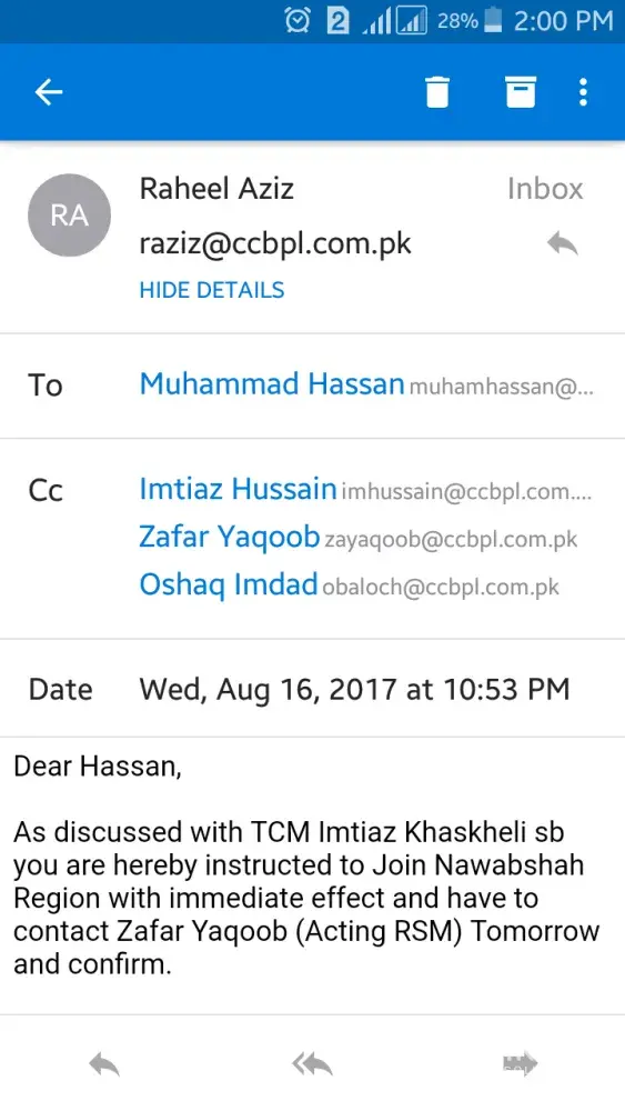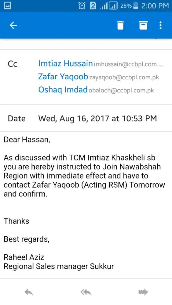 Unfortunately, all the scenario turned against me. The distributor blackmailed the managment by giving threat to join Pepsi and he demanded for punishment to me. On the same day, late night, my RSM called me having TCM, SM and distributor on conferrence; the TCM talked rudely and than humiliated me. Within half hour I received mail in which I was transferred 500km away from my here. I also received message from manager to accept the transfer without any voice or I will be terminated.