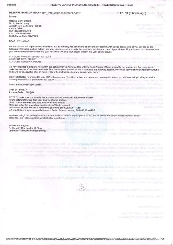 I got a mail from RBI i won 500000 GBP by [protected]@live.com