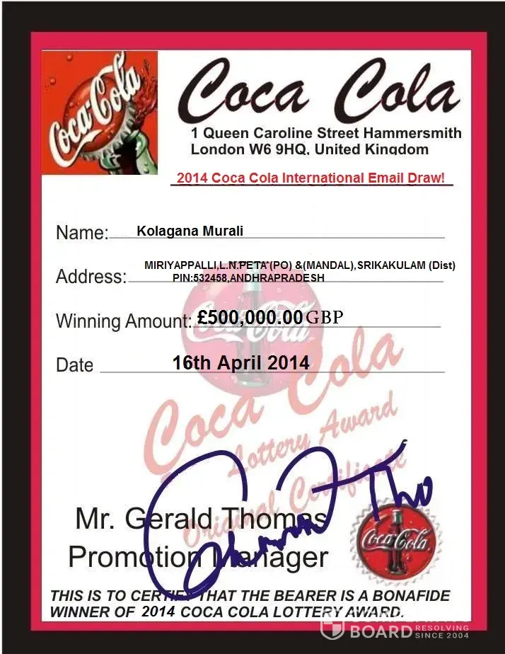 The coca - cola mobile draw london office (Uk) has discovered a huge number of double claims due to winners informing close friends relatives and third parties about their winning and also sharing their pin numbers. As a result of this, these friends try to claim their prize on behalf of the real winners. The coca - cola mobile draw london office (Uk) has reached a decision from headquarters that any double claim discovered by the promotion board will result to the canceling of that particular winning, making a loss for both the double claimer and the real prize beneficiary, as it is taken that the real winner was the informer to the double claimer about the promotion. So you are hereby strongly advised once more to keep your winnings strictly confidential until you claim your prize.