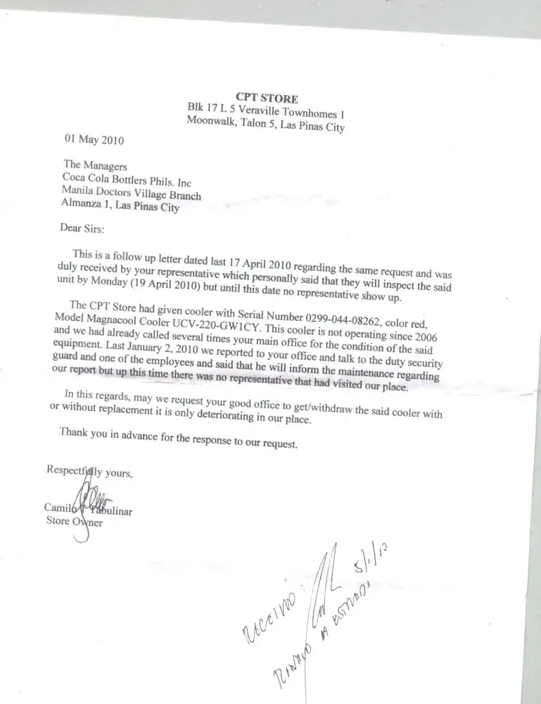 Forwarding the letter request from one of the customer of Centerpost Dealer, authorized dealer of CCBPI products in Las Pinas City.. Pls kindly make a quick response for this matter thanks!