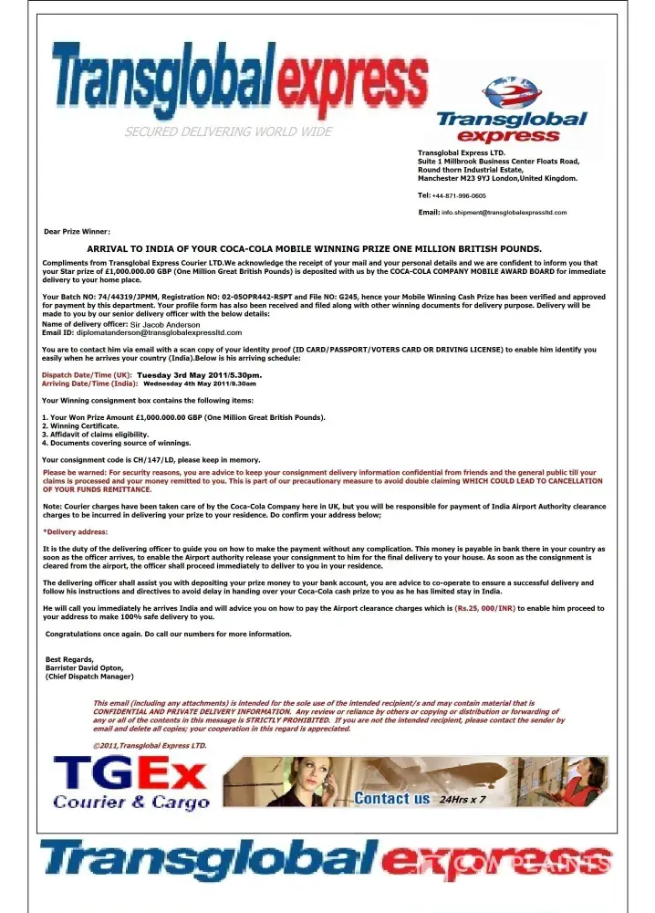 i received message from TD-020001 on 01/31/2012 on my cell that your mobile number is selected for 1, 000, 000.00 GBP IN COCACOLA 2012 to receive, send your(my) name, address and number TO DR, BENT VIA EMAIL:cokke2@msn.com Now i received email my parcel containing draft, certificate and necessary documents are dispatched through Diplomatic Courier ..He will reach in India by Tuesday morning with all and i cooperate him to clear the parcel from Custom Office by paying 351 GBP( rS.25, 000/- IN INDIAN RUPEES) as they can not subtract any amount from winning prize After making all formalities Diplomat will reach our doorstep to deliver the packaged parcel. PLEASE HELP ME TO KNOW ( VIA MY EMAIL srnagra43@gmail.com ) WHETHER IT IS TRUE OR FALSE.