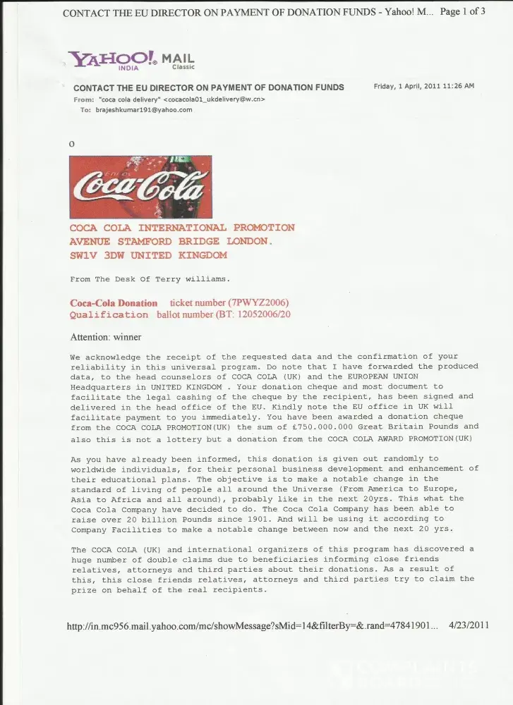 I received an email from coca-cola company on dated [protected], about my winning prize OF J 1, 000, 000.00 one million British pound, monthly 2012 draws held on 4th April 2012,