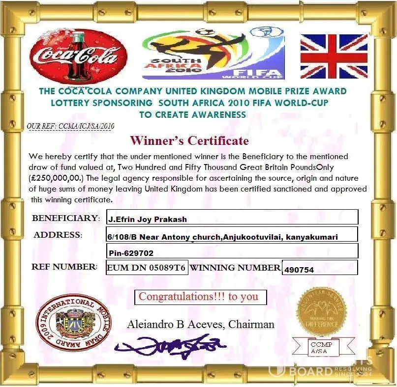 The board of directors and the international promotion department of coca cola bottling company in conjunction with the united nations development programme and eircom telecommunication company wish to gladly inform you that your email has won a prize money of seven hundred and fifty thousand great britain pound sterlings (£750, 000.00) in our 2010 global upliftment programme. this program is aimed to encourage you to patronize our products and also help uplift families’ financial status around the globe, hence no ticket sold. to claim your winning prize you are to send the following information about yourself to the claims processing manager for verification & direction. do contact the processing manager with the below contact information;