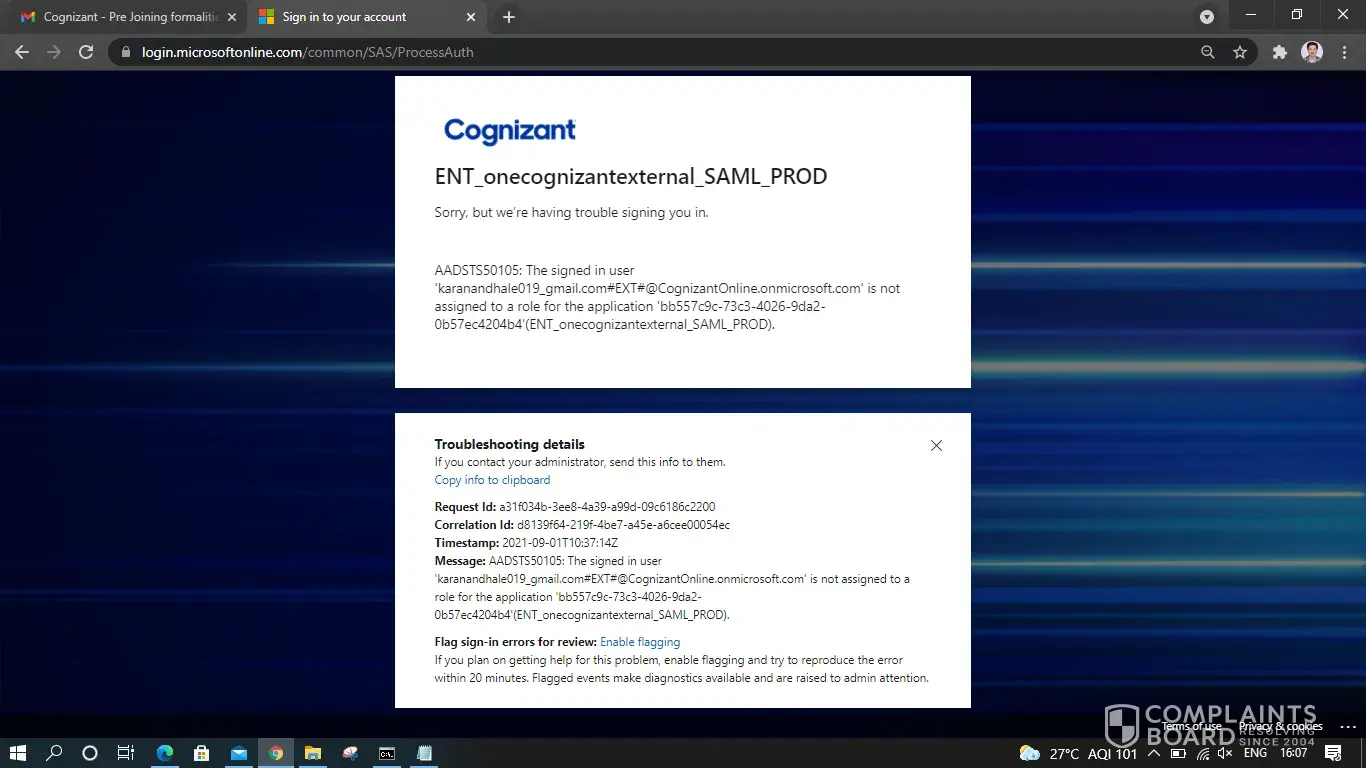 Yesterday (21 January 2022) was my joining date with cognizant.I haven't received my boarding pass yet.My interview held on october. I have been working from 2016 to 2019 at Aevea Technology as a .Net Developer.Actually my joining date with cognizant was 3rd january 2022 so i have resigned from my current company August Technology for joining with cognizant.i have given the current address of Aevea Technology which is given by Aevea employer and he is saying still company is there and due to corona employees are work from home and they replied to background verification team with their gmail as their domain mail was expired at first.Now they renewed their domain mail and replied to background verification team from their domain mail id [protected]@aeveatech.com.Now you are saying that my application is rejected.I am losing my chance without my reason.Waiting for your valuable reply.Aevea Technology's Company licence given from employer and my experience certificates sent already to my HR.