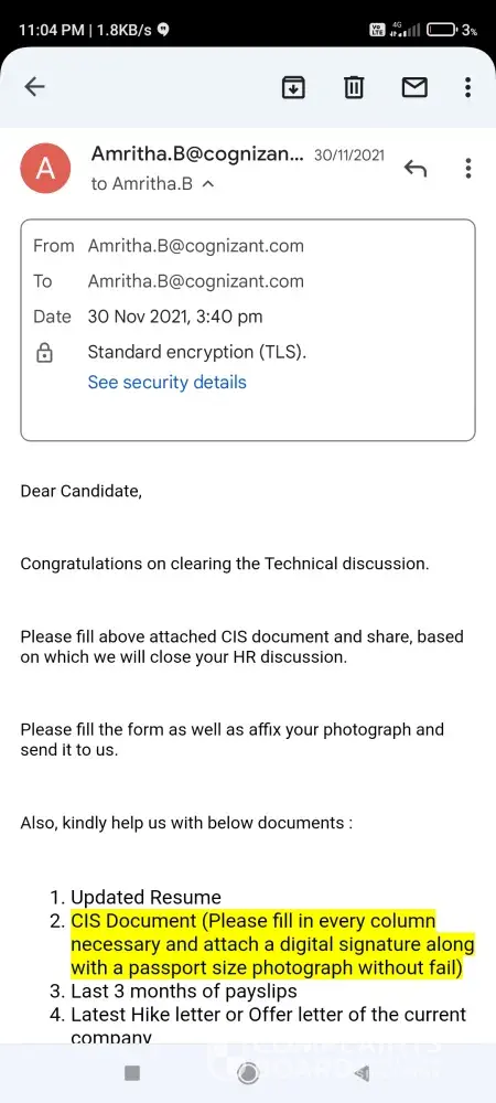 I had interview with CTS on 18 th November 2021. Then I got mail from Amritha.[protected]@cognizant.com to upload cis documents. I uploaded all the documents.