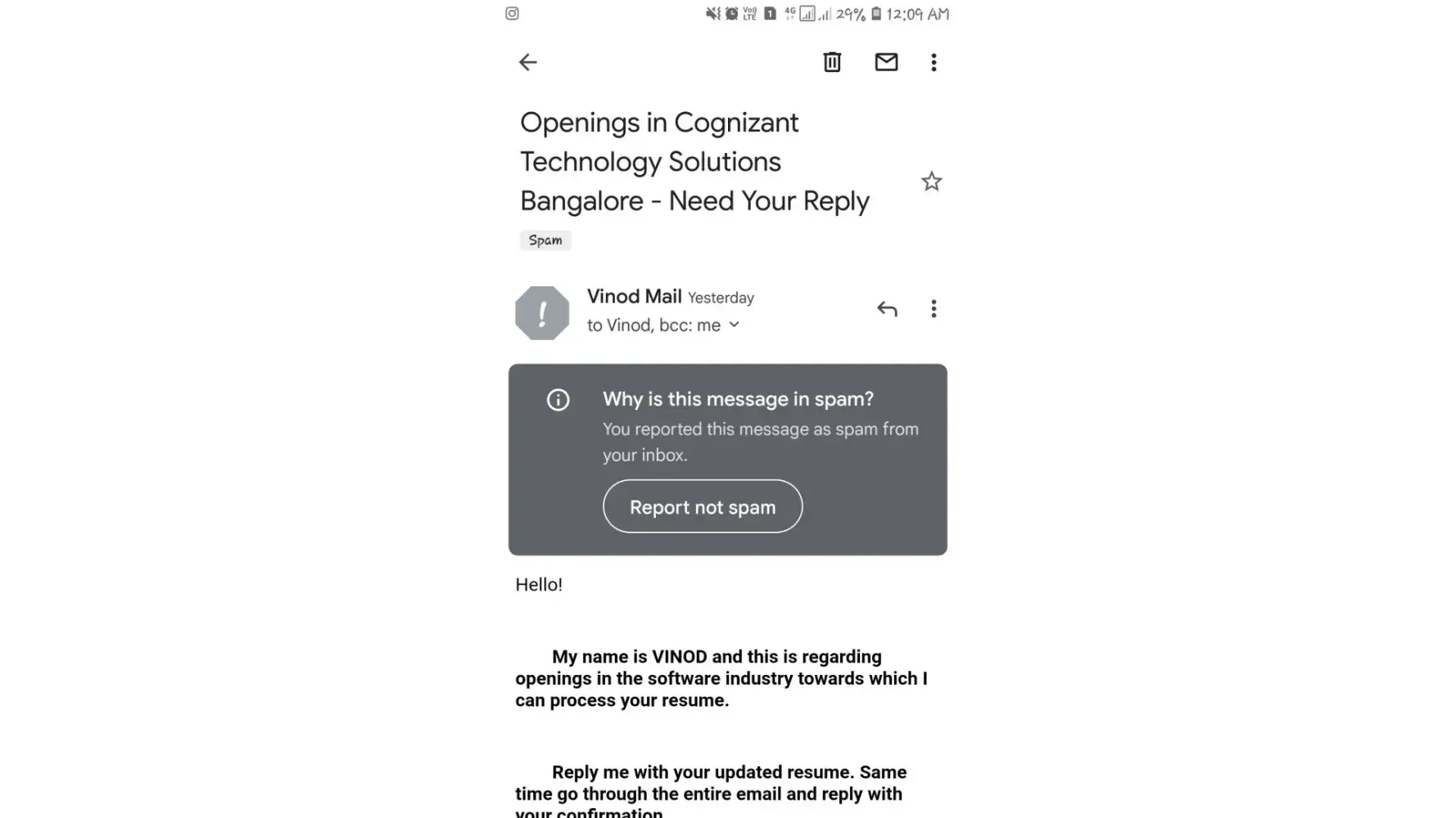 My name is VINOD and this is regarding openings in the software industry towards which I can process your resume.