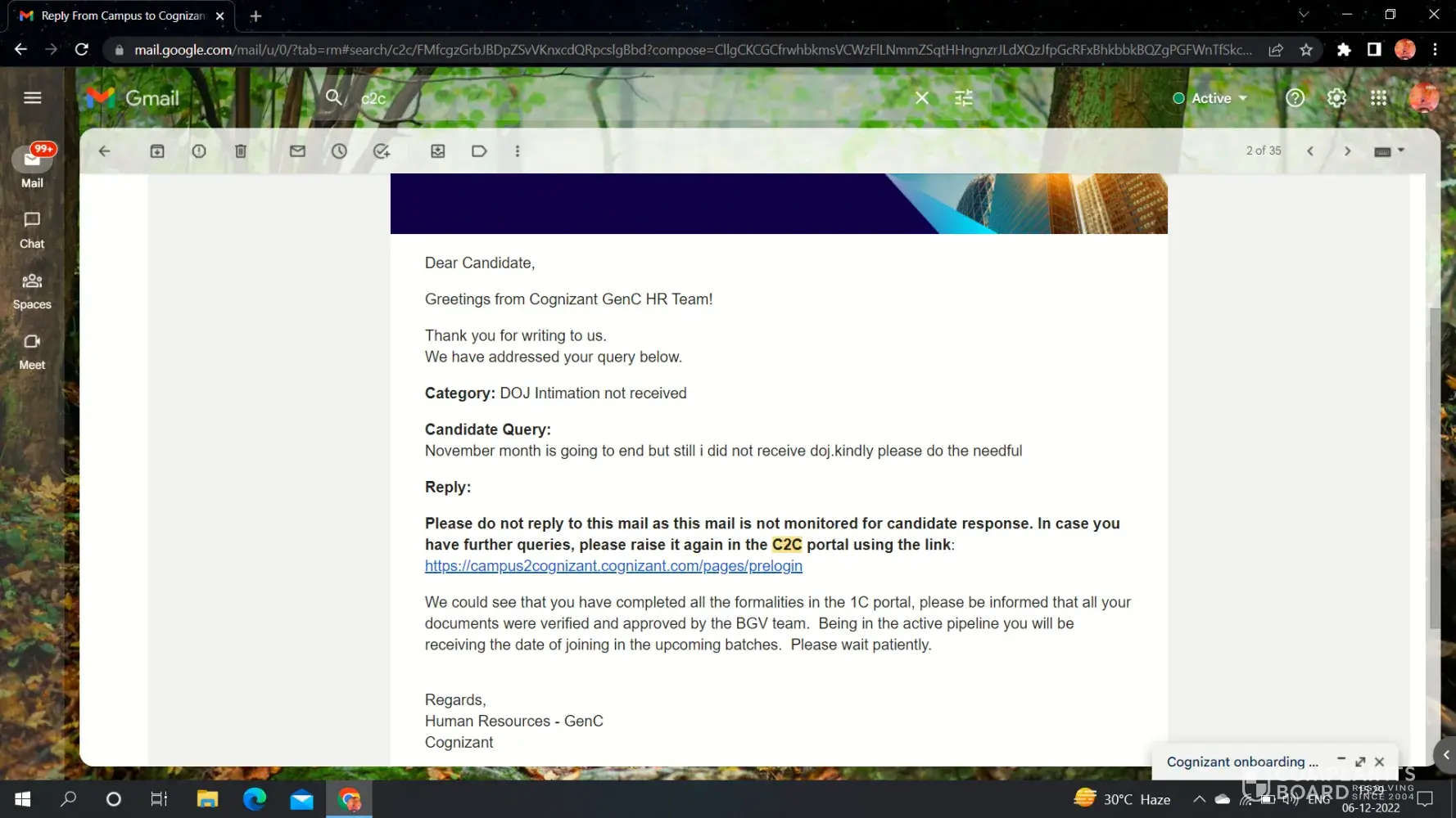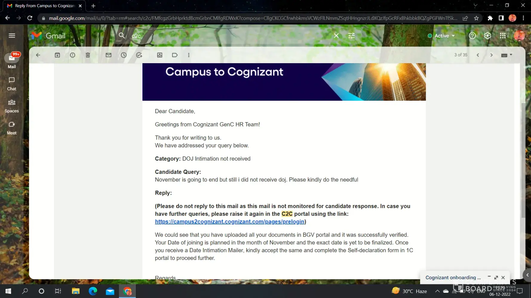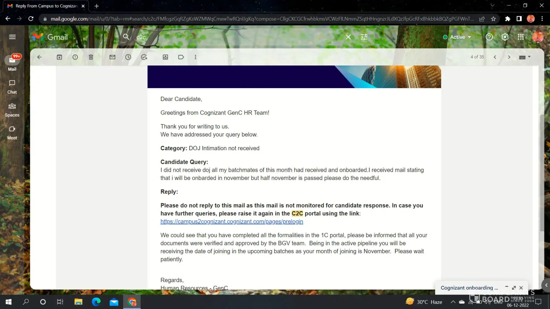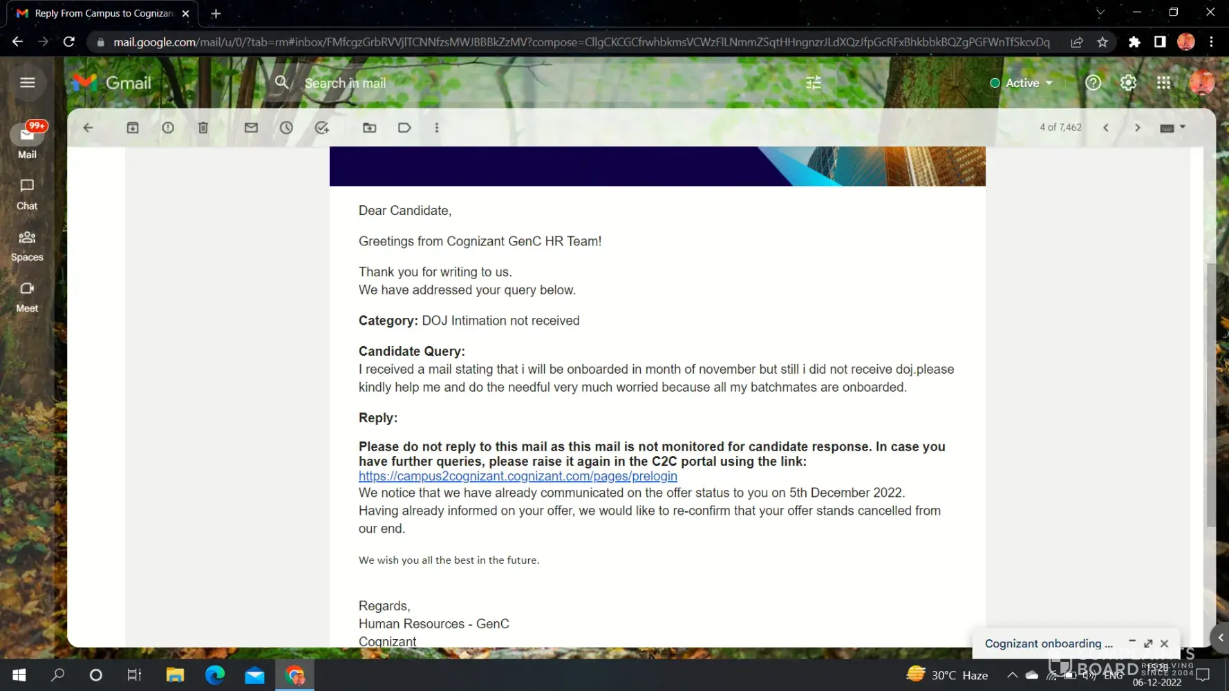 Again when I raised a query on December 5th I received a reply on December 6th "We notice that we have already communicated on the offer status to you on 5th December 2022. Having already informed on your offer, we would like to re-confirm that your offer stands cancelled from our end.". But I did not receive any communication email from Cognizant.