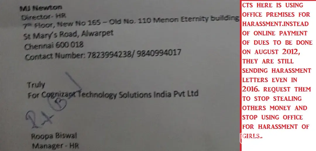 Thangeswari is still getting harassed by Cognizant INdia from 2006 to 2016 who are sending silly letters instead of payment of dues on time.