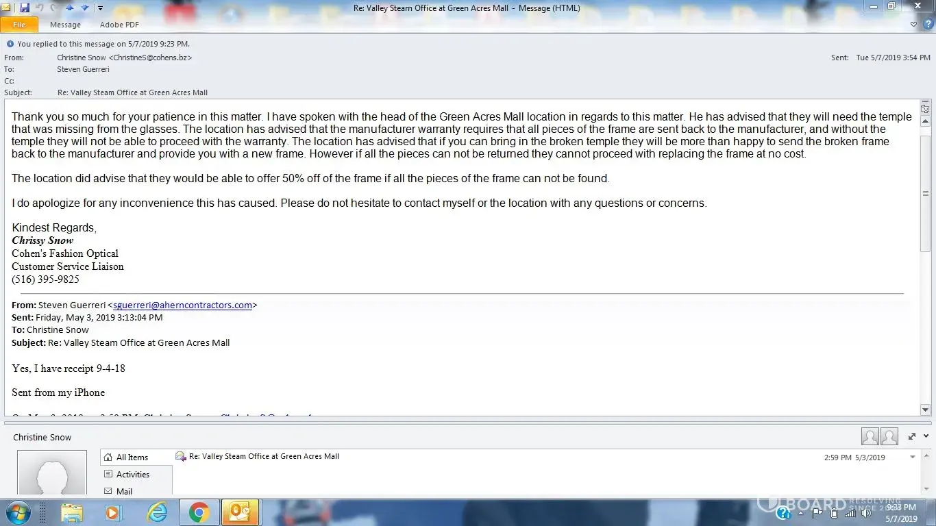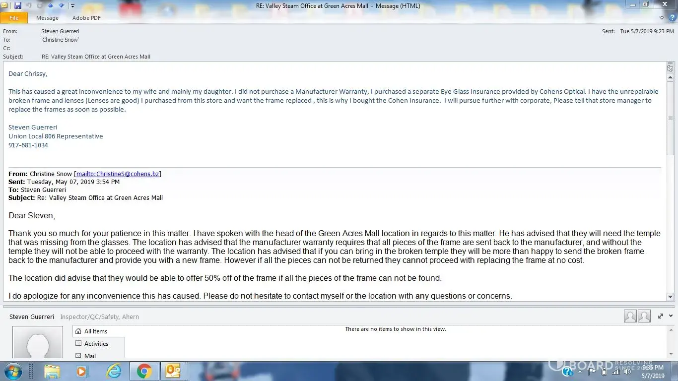 I purchased Cohen Insurance for eyeglass frames on 9-4-18. I have the broken glasses and tried to get them replaced. The store manager still wants me to pay for 50% of cost. This is not acceptable! The Lenses I purchased from this store are still good, I just need the frames replaced, this is why I purchased the insurance. One piece is missing because glasses broke in school and that is why manager refused to honor agreement. He is stating the Manufacturer wont replace, but I bought frames and insurance, not a Manufacturer Warranty. Please provide my proof that insurance is no good with piece missing or replace frames quickly. Steven Guerreri [protected]