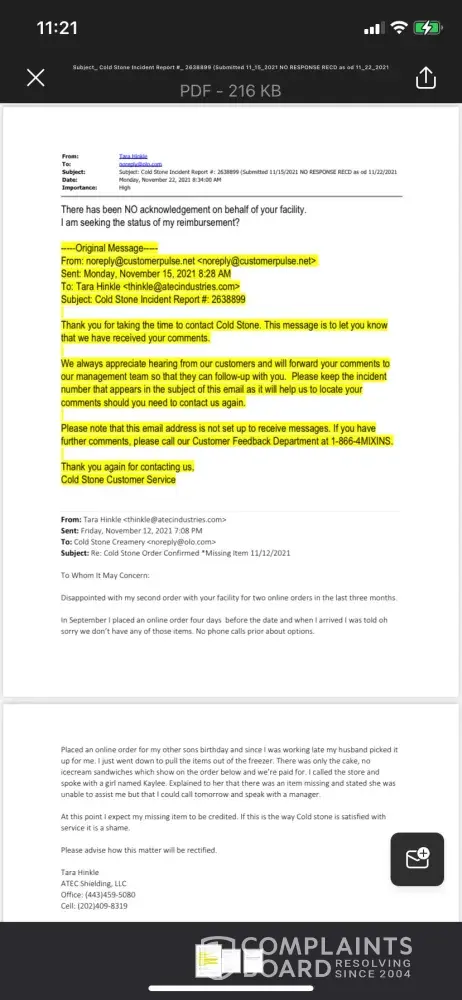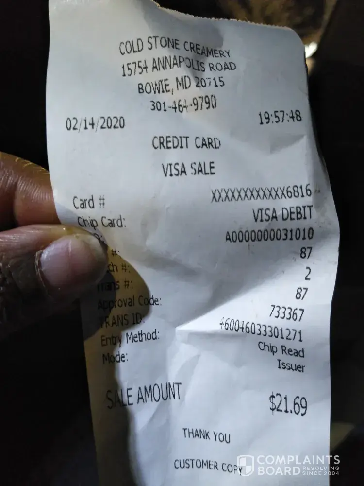 Read full complaintCold Stone Creamery complaints: history and resolution overview