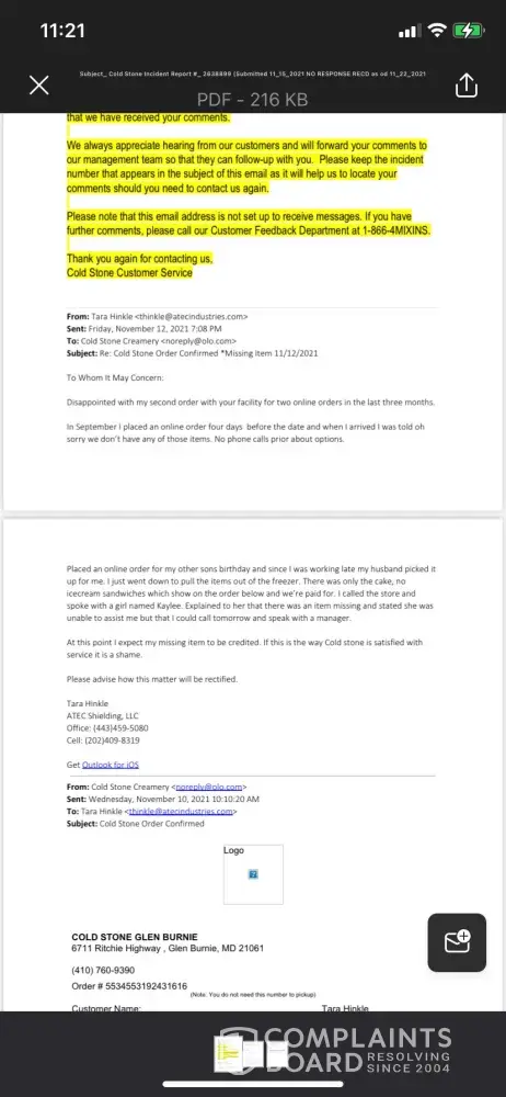 Dear Cold Stone Management, I am writing to formally express my disappointment regarding my recent experience with an order placed at your Manassas, VA location. On February 21, 2025, I ordered an Oreo ice cream cake for my daughter’s 10th birthday party, with a scheduled pickup on February 23, 2025. My family and I traveled an hour and a half to 8113...