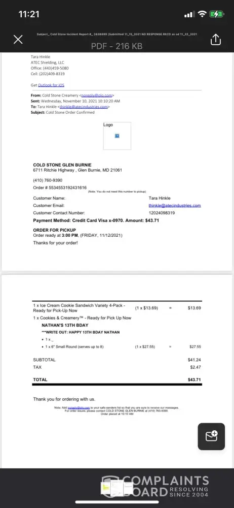 Read full complaintIs Cold Stone Creamery Legit?