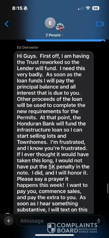 Ed Detweiler sold my house in sept 2024. He saw I came into a large amount of money and approached me and my boyfriend about investing in his personal business. Trusting him (he sold two houses for me) we naively did. We have a promissory note saying it would be paid back no later than October 2024. It is October 2025, he has not paid back, he has shown...