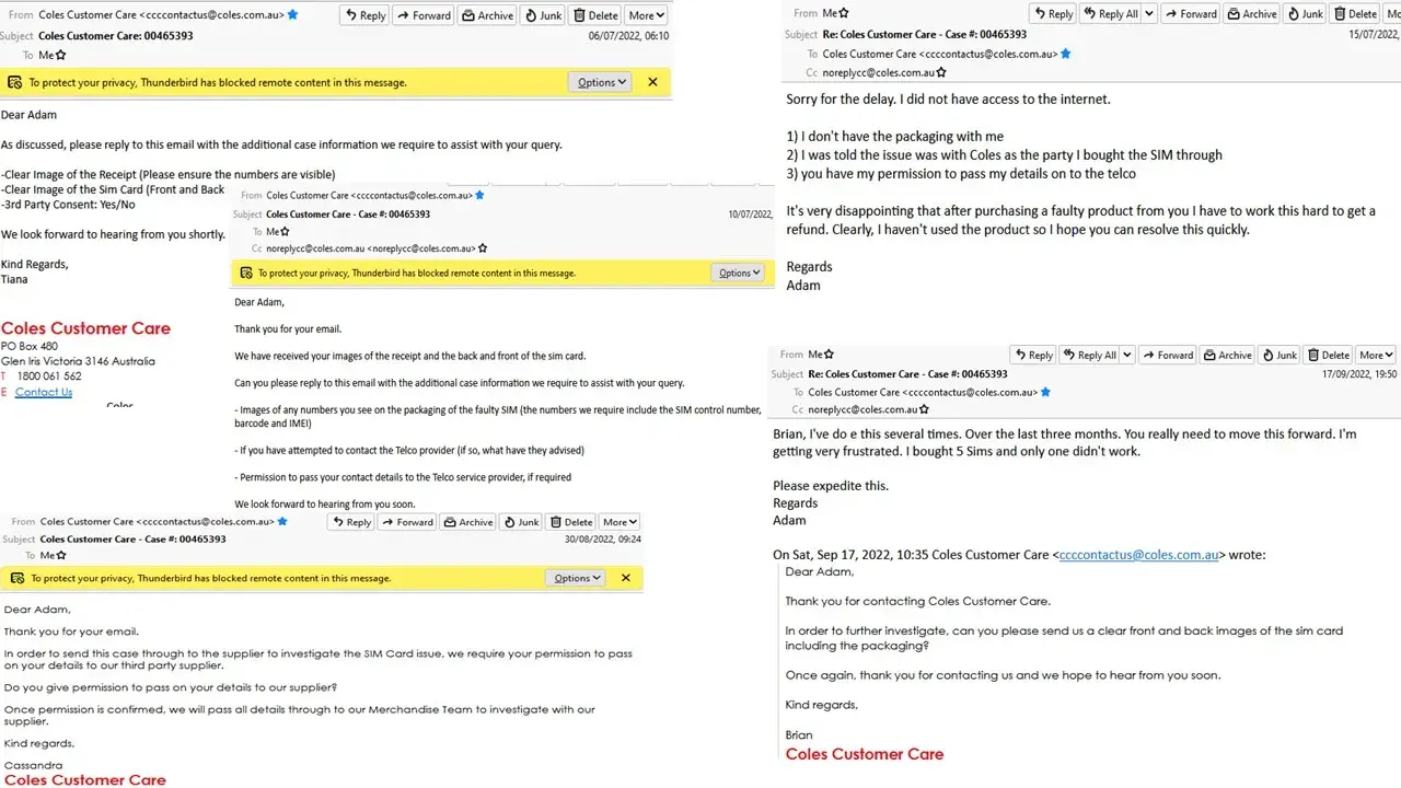 You can see in the series of emails below that even though the complaint case number doesn't change and even though they acknowledge receiving information from me, they keep asking for the same thing over again. Regards Adam