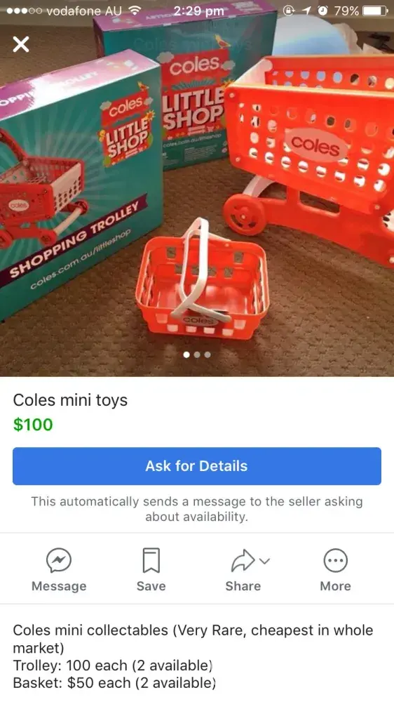 Hi I am quiet upset that I have tried every coles store near me to purchases the extra items you could buy to go with the coles minis all stores were sold out of the items within a day near me. Upon hearing that you are extending the promotion I called my local stores today and also head office to find out if you would be releasing more of the items to purchase I was told there had been no mention of it happening. It would be fantastic if the people who missed out on these items had a chance to purchase them rather than us only being left the option to purchase them at a ridiculous price off people who loaded up on them to on sell them for highway robbery. The promotion was aimed at children but I many of us parents have devastated children as we are unable to purchase the acssecires to go with the minis. I find it quiet discussing that Coles doesn't see a problem with people on selling the items as people are doing. I have seen the $2 baskets or $4 folder being sold on eBay and Facebook for $50 or more the $15 apron and bag set for around $75-100 and the shop front or trolley from $100 and up.