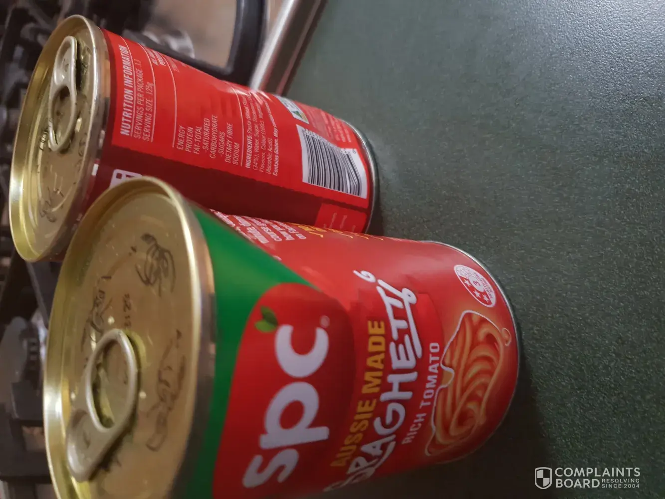Purchased 2 x 420g SPC tinned spaghetti from Coles Gladstone. Cans heavily dented.