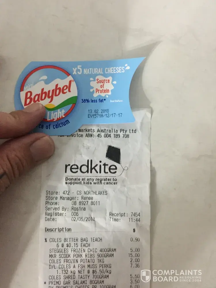 On the 02 MAY 2018 I purchased a pack of babybel lite cheese from Coles Northlakes Darwin, with my faith I had in Coles freshness guarantee I purchased the item with out checking the best before date. I gave my three year old son one of the cheeses and after he started eating this he can to me complaining that his cheese tasting strange. I then when back to the packet and seen the used by date of the pack was the 13 February 2018. I am completely repulsed that Coles would have on there shelf a product two and a half months out of date, which I had fed my three year old son!