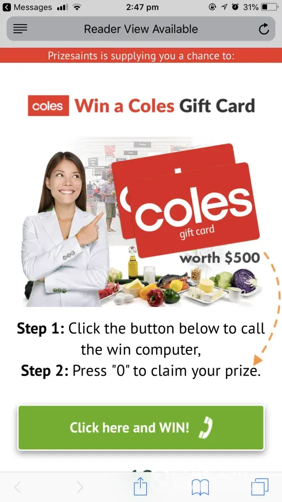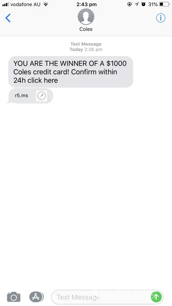 So I received a text message saying I've won a $1000 credit card and I need to accept it in 24 hours. The message display name came from Coles. I have a screenshot I can attach.
