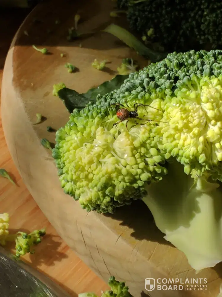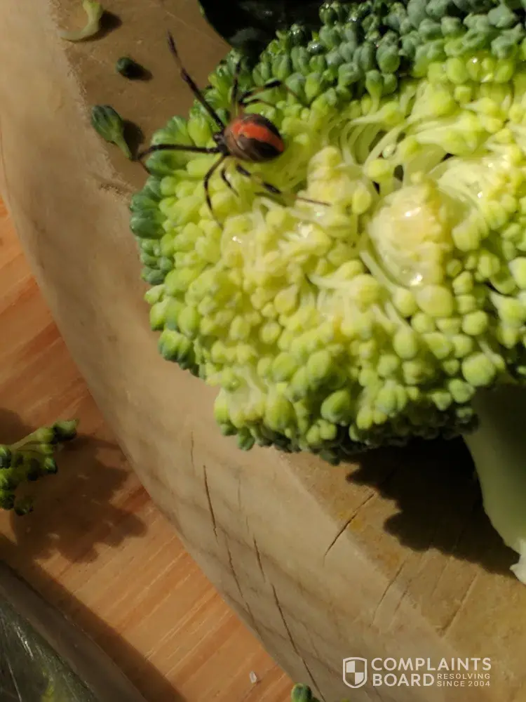 A redback spider was found in our broccoli stem that had been bagged and sealed directly from Coles and refrigerated until opened. This left absolutely no way for the spider to have made its way into the stem except prior to our purchase of the product from the supermarket. Thankfully we noticed the spider before it could do harm, as my mother was chopping the product when the creature emerged from within the bunch. Being the second most deadly spider on the planet, we don't like to imagine what could have happened had she not noticed the redback and been bitten, and thus the much more immense implications this would have had on Coles. We still have the receipt to show our proof of the purchase of this product from Coles Doncaster (Westfield).