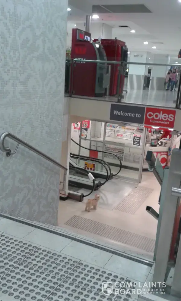 Two photos attached for dogs in the complex where coles supermarket kings cross and north sydney. 1/ the dog could attack someone walking out the supermarket and 2/ dogs carry all kinds of germs why security allows this no dogs allowed in complex of coles supermarket yet the customers still do it. Can something be done, please. Germs! Fruit and vegetables can be contaminated by the dog., or bite someone walking out of the supermarket. Consequence