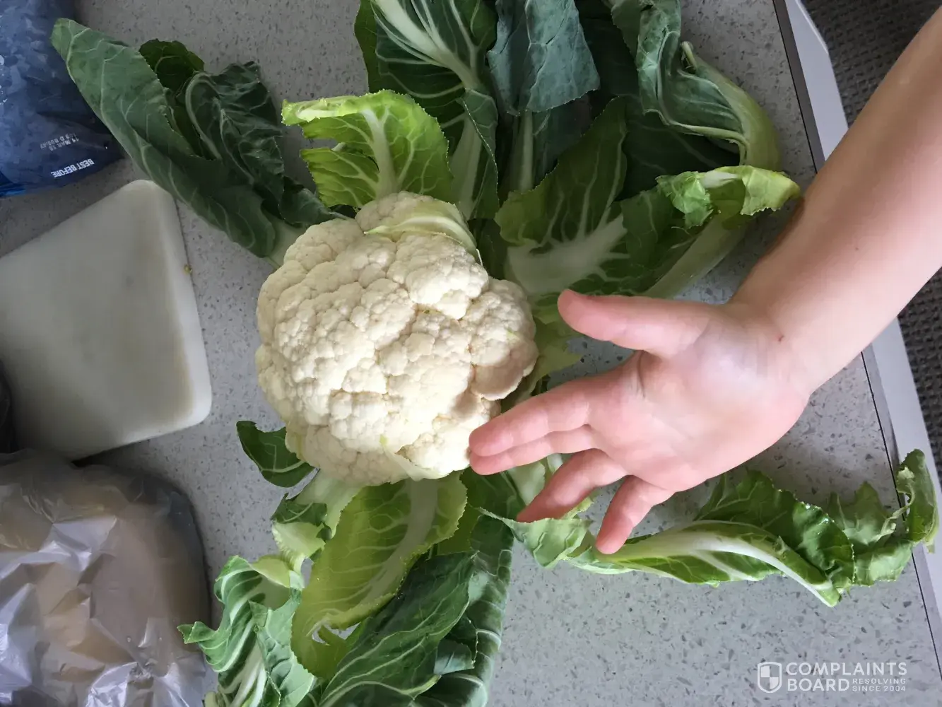 I have just received my online order of which included one whole cauliflower, only to reveal the tiniest cauliflower that I have seen. I have included a photo alongside my three year olds hand so that it can be seen just how small it is, and my son is only of average size. Absolutely poor standards and to think that the person packing obviously had no sense to question its size. Purchased from Caboolture online delivery 2.12.17 order [protected].