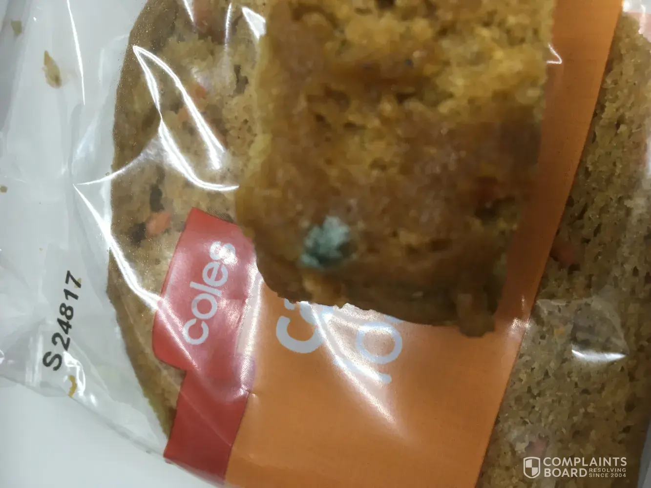 Purchased 5 days ago. I've been loving these single serve cakes from Coles. Individually wrapped for extra freshness and ease of popping in your lunchbox. So was super disappointed when I'd already taken a bite of one this morning, went in for another bite only to find it mouldy! There's only one thing worse than mouldy cake and that's mouldy cake you've already taken a bite of!