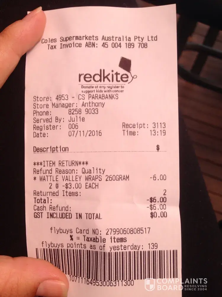 When I got back to Coles I politely explained the situation and asked if I could exchange them. The staff member was extremely rude and said they were too busy to go get some more and told me I had to return back into the store to get more and then come back and wait in the line like everyone else. So I had to take all my kids back into the store to grab another packet of wraps and as I was walking back to the register, there was another staff member walking back to the wraps section with the wraps I had just returned so obviously they weren't that busy. I then waited with all my kids back in the checkout line to repurchase the wraps.