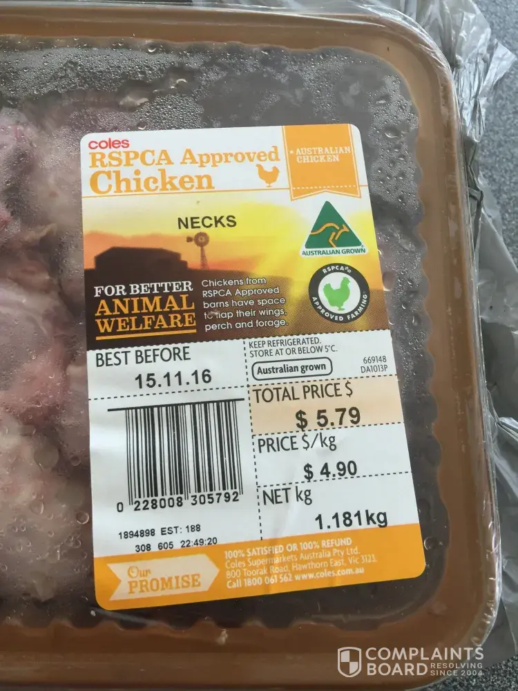 On the morning of Friday, 11th November I purchased over $120 worth of food including approximately $50 worth of MEAT for our family. The chicken necks in the photo were for our dog. I purchased 2 of these packs for our dog and both packets were "OFF". This was obvious once opened [the first pack on that same day] and the second pack last night after freezing them that same day. According to the use by date these were clearly in date and should not have intensely smelled the way they did immediately after buying them. They weren't even 'on special' . I shop regularly at Coles and spend at least $100 each time I visit which may be up to two or 3 times a week. I am usually overall happy with the products, price and service, however this time is unacceptable as we fed these to our dog and he was even sick due the obvious reason the food was "OFF". I would appreciate some compensation for not only the money spent and the inconvenience of our dog being sick; but also the dissatisfaction of product and subsequent un-reliance for purchasing groceries from Coles in the future. I trust this will be taken seriously and I will be compensated accordingly. NOT a happy customer!