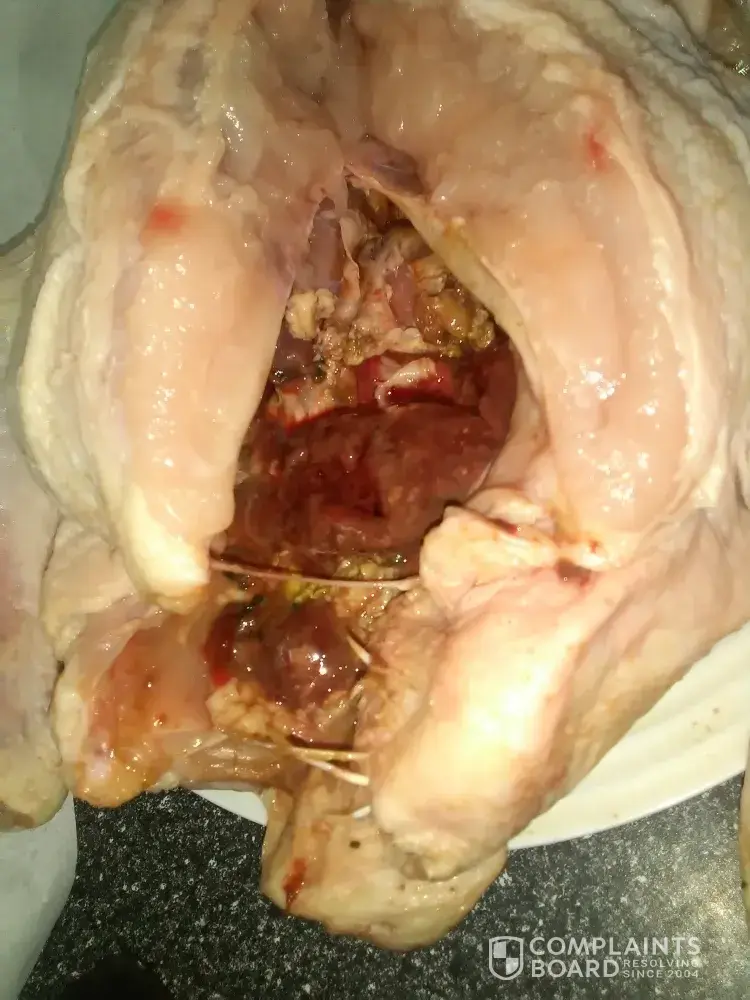 To whom it may concern, I purchased a whole chicken in your point cook store, when I went to cook the chicken I noticed something weird dripping from the inside. I looked inside the chicken and I seen something really dark red inside so I cut it opened and noticed something very disturbing inside the chicken. It looks like lumbs of redish purple tissue of some sort and a wired looking mucus. I am very disappointed by this I have a young child who would have eaten the chicken and god knows what our family could have got from this. Kind regards colette molloy