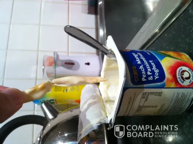 When eating the Peach, Mango and Passionfruit flavour, I was disgusted to find a long strip of transparent pale orange plastic (8.5cms in length) inside the yoghurt which i nearly swallowed.