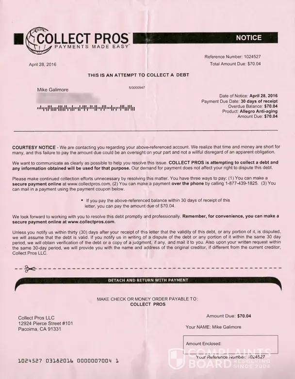Yesterday I received a Notice to collect a debt from Collection pros for an item I was foolish enough to buy online. I did indeed purchase their product. What I didn't do was order twice as much. At the time of purchase I paid with my credit card the amount due in full. When I received their product and it was 2x the amount I ordered I immediately suspected they were scamming me. Sure enough today I received a pink letter from Collection Pros dated 4/8/2016 with the header "THIS IS AN ATTEMPT TO COLLECT A DEBT". You can see where this is going? They send me product I did not order then without any prior notice I get this collection letter. That's the scam. Send order out the door than follow up with collection letters? This is America - not Russia and I'm not going to telegraph my plans for Collection Pros. Let's just say it's time to make some noise and put these scam artists out of business. If you're reading this Collection Pros make note of my name. You will hear it come up again. RIP OFF! THEIR PRODUCT IS " CLEANSE BLAST". IF YOU SEE THIS ADVERTISED RUN AS FAST AS YOU CAN IT'S A SCAM!