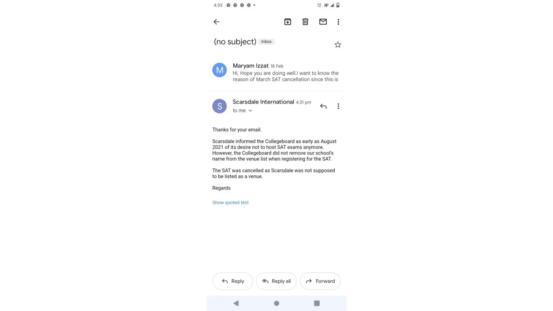 Or send official letter from college board the reasons of cancellation then I will go to court against the college board