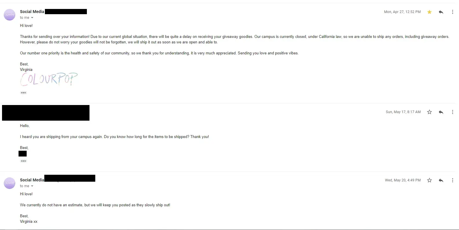 There are so many posts regarding Colourpop and their bad customer service, but I just want to discuss that I won a whole collection giveaway and they just won't give it to me. Emailed their CS back and forth, but nothing. The photo is me sending an email to their secret giveaway email. It's been 4 months, like what is going on? I have been with them since they started out as a company and they used to be so good. I got my items on time and everything was there. When I was trying to look through reviews to see if people have the same problem as me, I discovered so many people with customer service issues and getting wrong products, missing items, not getting the shipment at all, etc. I contacted their Twitter, IG, Tik Tok, Facebook and they told me to contact them through email, which I did already. Their rep replied back telling me to email the secret email, and I have already emailed them twice for a follow up. It's disappointing to see a company that keep posting newer and newer collections instead of addressing the real issue here.