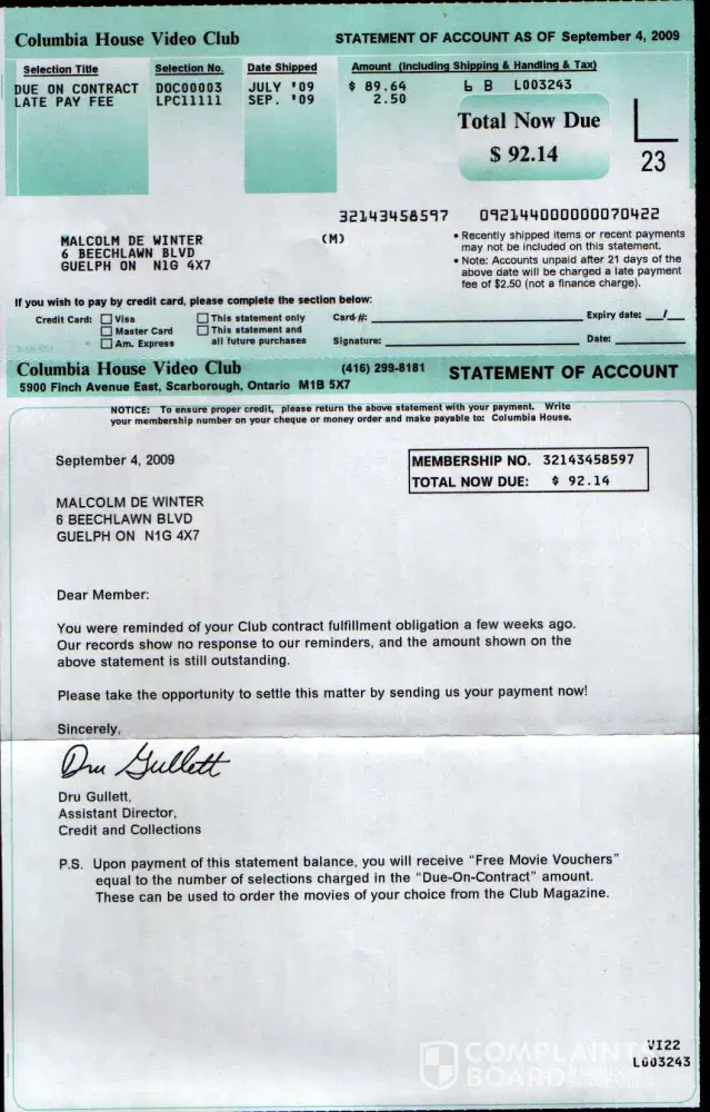 I have received notice after notice from Columbia House for a membership I never signed up for. They're claiming I owe $124.70 for DVDs and a membership I've never signed up for. They claimed I signed a contract with them which I've never done. Columbia House also fails to have anyway to contact them besides an automated telephone line. I've yet to speak with a real person. They also don't seem to accept any letters that are complaining their charges. I've never received anything nor ordered from this company and am wondering how they got my name and address. If Columbia House turns this over to a collection agency I just may place a punitive damages charge against the company if they fail to respond to my letter. Also this seems to be the 5th Final Notice I've received from them. I also do not want my credit score hurt by the irresponsibility of Columbia House.