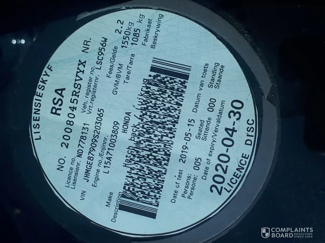 Bought vehicle cash sale R160000 from Honda the Glen in Gauteng.